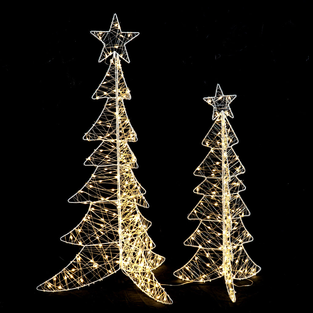 Enhance your Christmas decor with this set of 2 wire LED metal geo Christmas trees. With 300 WW LEDs, iron build, they're outdoor - ready. Long wires, IP44, UL - approved. Perfect for a festive display!