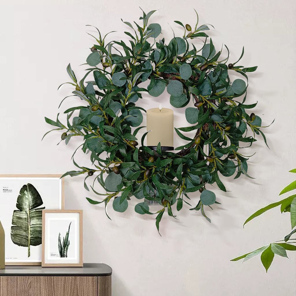 Candlelit Wreath in Eucalyptus and Olive Foliage with Candle Holder. 24in dia