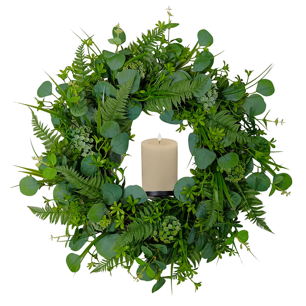 Candlelit Wreath in Mixed Foliage and Eucalyptus with Candle Holder. 24in dia