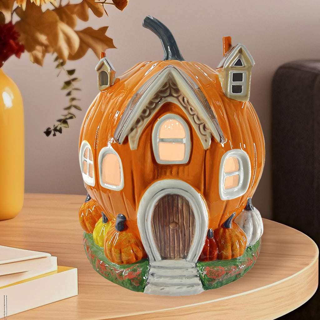 This hand-painted ceramic pumpkin village house showcases a faux wood door, glowing windows, and delicate detailing. Adorned with small pumpkin accents, it exudes festive charm, blending artisanal craftsmanship with a whimsical pumpkin-themed design.