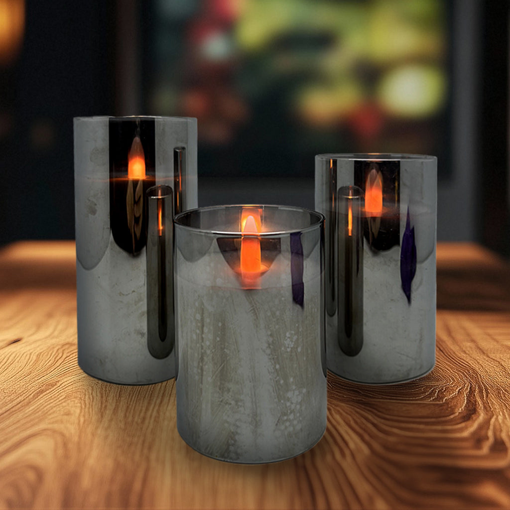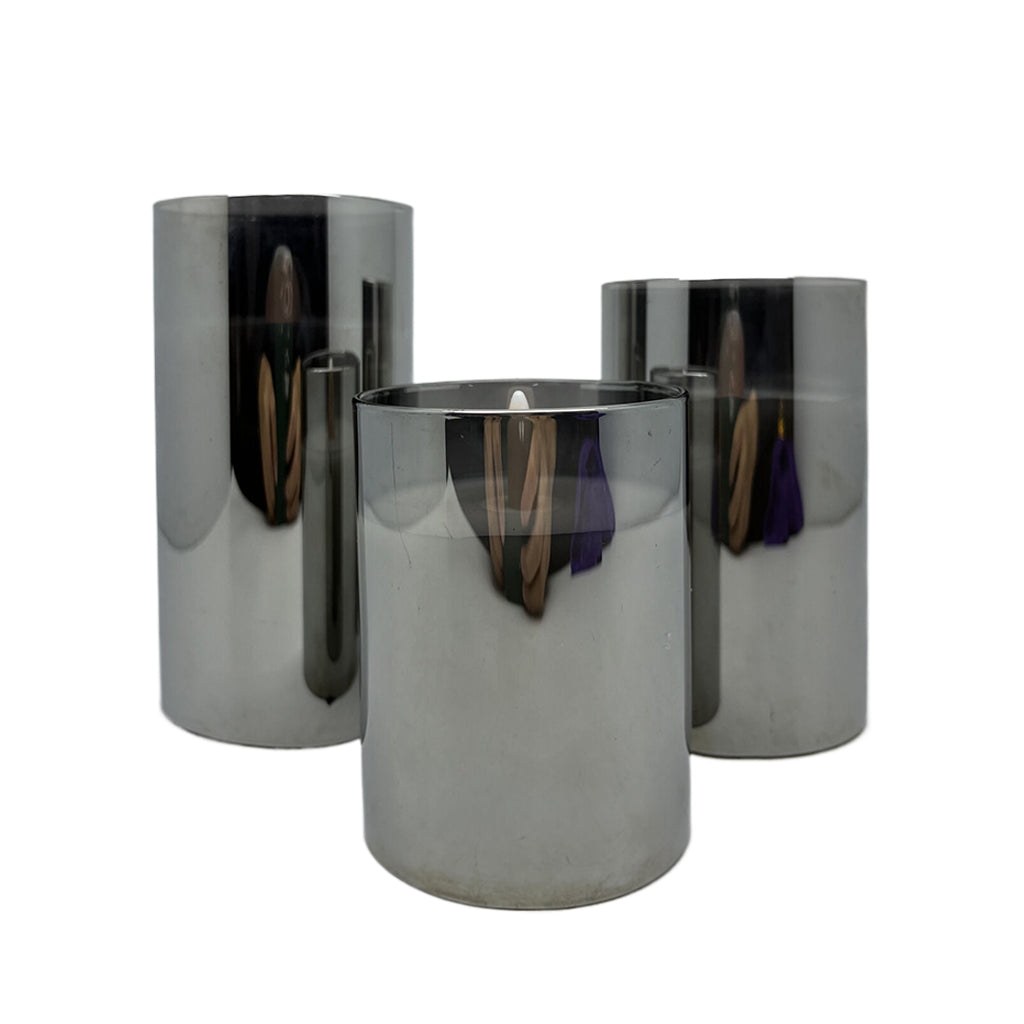 Set Of 3 Silver Mercury Glass And Wax LED Candles | 3 Inch Dia X 4 Inch High, 5 Inch High, 6 Inch High | With Remote